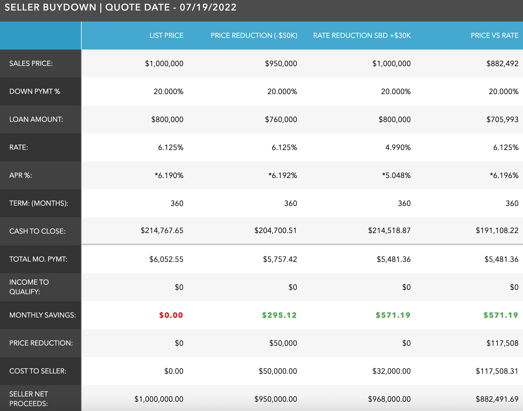 For example, let’s look at a property on the market for $1,000,000. A prospective buyer would likely put 20% down and have a loan of $800,000. With an APR of 6.19%, the total monthly payment would be $6,052.55. If someone started their home search at the beginning of the year, they may have started out planning to have a monthly payment of around $5,500 a month. Typically, the two sides will begin negotiating on price and could try to drop the sale’s price by $50,000. Going that route would decrease the monthly payments for the buyer to $5,757.42 and save them just under $300 a month. Alternatively, the seller can purchase points on the mortgage. If the seller contributed $32,000 to the mortgage rate, the buyer’s APR becomes 5.048%, the monthly payment drops to $5,481.36, and the buyer saves $571.19 a month. For the buyer to have the same payment, the sale’s price would need to decrease to $882,492, representing a loss to the seller of almost $120,000. As you can see, negotiating on the mortgage rate can be a very effective tool that leaves both parties in a better position than negotiating on price alone.