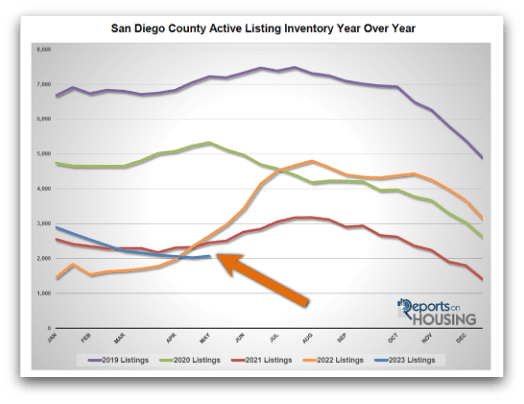 FACT – The active inventory in San Diego County is at its lowest level in May since tracking began in 2012. Housing is experiencing a crisis, a catastrophically low level of available homes. During the Great Recession, a glut of homes was on the market. Today, the market suffers from the opposite condition: a minimal supply. For housing to tip in the buyer’s direction, the inventory needs to rise at the very least to pre-pandemic levels. The 5-year average peak from 2015 to 2019 was 7,344 homes. There are only 2,076 homes available today. Last year, the inventory grew substantially from April through August, peaking at 4,806 homes. It stopped climbing due to a lack of sellers coming on the market. The inventory is not poised to rise anywhere near 5,000 homes anytime soon.
