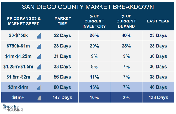 In the past couple of weeks, the luxury inventory of homes priced above $1.5 million increased from 741 to 776 homes, up 35 homes, or 5%. Luxury demand increased by 12 pending sales, up 4%, and now sits at 294. With supply and demand increasing at similar rates, the overall Expected Market Time for luxury homes priced above $1.5 million remained unchanged at 79 days. The San Diego luxury market is by far the hottest in Southern California. The luxury ranges are not selling as fast compared to last year, yet it has been improving. Last year, the luxury market was decelerating and not accelerating like today.