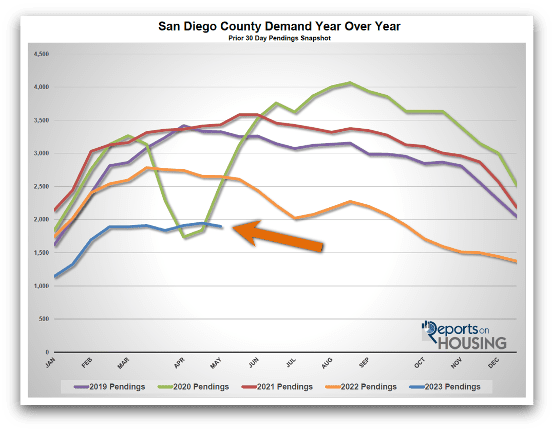 Homeowners continue to “hunker down” in their homes, unwilling to move due to their current underlying, locked-in, low fixed-rate mortgage. For April, 2,299 new sellers entered the market in San Diego County, 2,631 fewer than the 3-year average before COVID (2017 to 2019), 53% less. These missing signs counter any potential rise in the inventory.