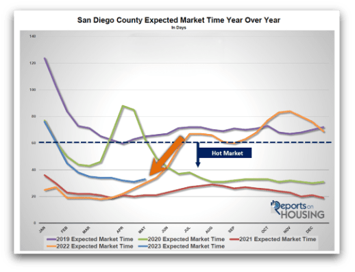 With supply rising and demand falling, the Expected Market Time (the number of days to sell all San Diego County listings at the current buying pace) climbed from 31 to 33 days in the past couple of weeks. Last year the Expected Market Time was 30 days, slightly faster than today, yet it was cooling fast due to increasing rates. The 3-year average before COVID was 54 days, a slower pace than today
