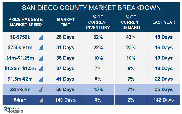 Current demand levels are at Great Recession levels. Today’s demand, a snapshot of the last 30 days of pending sales activity, is at 1,893. Last year demand was at 2,599, or 37% higher. The 3-year pre-pandemic average is 3,045, or 61% higher. Yet, even with ultra-low demand, in matching it up against today’s ultra-low inventory, the San Diego County housing market is extremely hot. The Expected Market Time, the time between coming on the market and pending status, is at 35 days. While not as hot as last year’s 19-day reading, it is considerably lower than the 3-year pre-COVID average of 55 days.