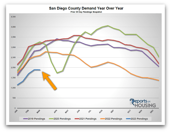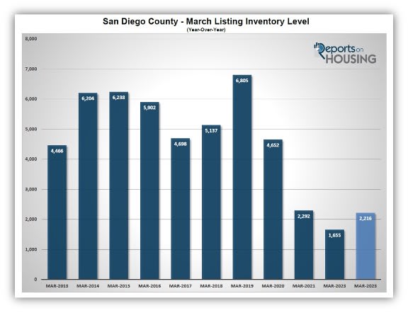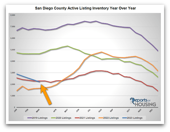 Today, there are only 2,216 homes available to purchase in all of San Diego County. There were 1,655 last year, catastrophically low and 25% lower than today. In 2021, there were 3% more. The marketplace is complaining about a lack of supply, just like they did in March 2021 and 2022. The lowest level by far before COVID was achieved in 2013 at 4,466 homes. That was 102% higher than the current level, more than double. The 6-year average from 2014 to 2019 for this time of year was 5,831 homes, an additional 3,615, or 163% extra. The current inventory level remains severely low.